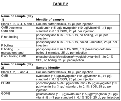 - A gel filtration standard comprising specific protein combinations such as ovalbumin, myoglobin, and vitamin B12, or phosphorylase b, ovalbumin, and myoglobin, with optional reducing agents like dithiothreitol, is developed to provide sharp, symmetrical peaks suitable for denatured conditions, covering molecular weight ranges from 1.35 kDa to 97 kDa, enabling effective system suitability testing.