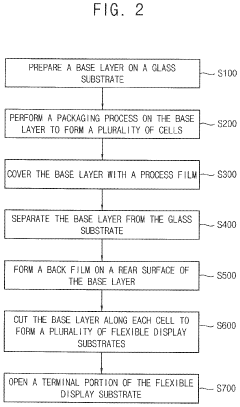 Technical Solution:  BOE Technology has established comprehensive standards compliance frameworks for flexible display substrate manufacturing, focusing on their proprietary COP (Chip on Plastic) and COF (Chip on Film) technologies. Their flexible OLED production adheres to GB/T 38464-2020 Chinese national standards for flexible display panels and IEC 62715 international standards for flexible display devices. BOE's substrate manufacturing process incorporates high-precision laser cutting technology with tolerance control of ±5 micrometers, ensuring dimensional stability across production batches. Their flexible display substrates undergo standardized reliability testing including 200,000+ folding cycles at various temperatures (-20°C to 60°C) and humidity levels (45-85% RH) to verify compliance with durability standards. BOE has implemented automated optical inspection systems that can detect surface defects as small as 1 micrometer across their production lines, maintaining quality control standards with 99.5% yield rates. Their manufacturing facilities maintain ISO 14644-1 Class 5 cleanroom environments with particle counts below 100,000 per cubic meter to ensure contamination-free substrate production.