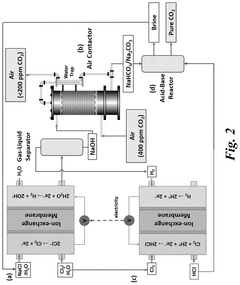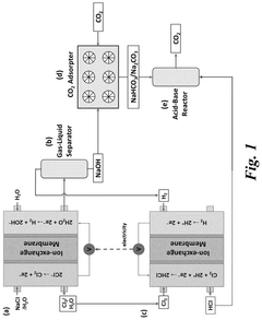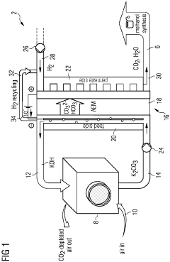 Understanding the electrochemical reaction mechanisms is essential for improving CO2 capture kinetics. The process typically involves the reduction of CO2 at the cathode and complementary reactions at the anode. Factors affecting reaction kinetics include electrode potential, electrolyte composition, temperature, and pressure. Advanced characterization techniques such as impedance spectroscopy and in-situ spectroscopy help elucidate these mechanisms, enabling the design of more efficient CO2 capture systems with enhanced reaction rates and selectivity.Expand Specific Solutions05 System integration and operational parameters