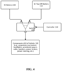 - A hybrid power system for electric vehicles incorporating at least one electrochemical battery and one supercapacitor top-off battery, with a controller managing the switching between the two to optimize power delivery based on current flow, temperature, and predicted load, ensuring efficient energy use and extended battery life.