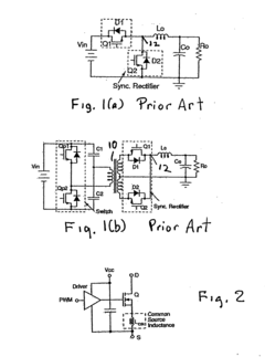 - Gate driver optimization to mitigate parasitic effects: Optimizing gate driver circuits and their layout is essential for mitigating parasitic effects in synchronous rectifiers. This involves placing gate drivers as close as possible to MOSFETs, using dedicated power and ground planes for driver circuits, implementing separate gate resistors for turn-on and turn-off paths, and employing specialized driver ICs with adjustable slew rates. These optimizations help control switching speeds, reduce ringing, and minimize the impact of parasitic inductances on circuit performance.