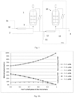 Technical Solution: Dow has pioneered a continuous flow reactor design for ethyl propanoate synthesis using a novel reactive distillation approach. Their system combines reaction and separation in a single unit, significantly reducing equipment footprint and energy consumption[1]. The process utilizes a homogeneous acid catalyst in the liquid phase, with ethanol and propionic acid fed continuously into the reactor column[2]. As the reaction progresses, the ethyl propanoate product is continuously removed via distillation, driving the equilibrium towards product formation. Dow's technology achieves conversion rates of up to 98% and product purities exceeding 99.5%[3]. The system operates under mild conditions (atmospheric pressure, 70-90°C), with a total residence time of approximately 30 minutes[4].