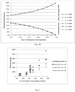 - A continuous process involving a series of stirred polymerization reactors with controlled feeding of ethylene, butadiene, and a hydrocarbon solvent, using a metallocene catalytic system to maintain a specific mole ratio of ethylene to butadiene, ensuring a high molar fraction of ethylene units and controlled microstructure, with operating conditions optimized for productivity and homogeneity.
