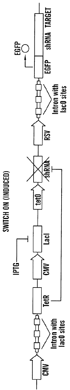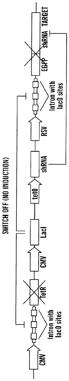 - A tunable genetic switch using a synthetic gene network that combines repressor proteins with RNA interference (RNAi) to tightly regulate gene expression, minimizing background expression by targeting non-coding regions of transgenes and allowing for inducible control through external agents like IPTG.