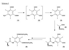- A process involving the direct condensation of tri-iodinated penta-substituted N-sulfinylanilines with α-hydroxyacids or their salts in the presence of a base, under mild conditions, to produce carboxamido derivatives in high yields and purity, bypassing the need for troublesome intermediate synthesis.