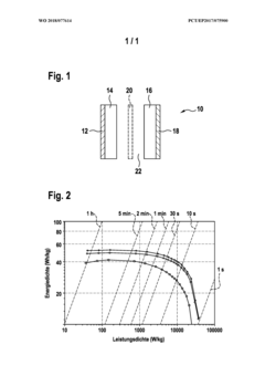 The architectural design of hybrid supercapacitor systems significantly impacts cycling performance and energy retention. Integrating supercapacitors with batteries or other energy storage technologies in optimized configurations allows for leveraging the high power density of supercapacitors while maintaining energy density. Advanced control algorithms and power management strategies enable efficient energy distribution between storage components, reducing stress on individual elements and enhancing overall system durability and energy retention.Expand Specific Solutions05 Novel encapsulation and packaging techniques