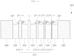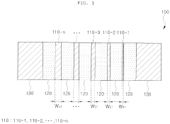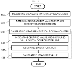 - A method involving a standard material with a series of nanostructures of certified values of different sizes, alternately stacked with intermediate layers, is used to calibrate the microscope measurement scale by measuring widths and determining deviations, allowing for linear fitting and calibration of measured values to align with certified values.