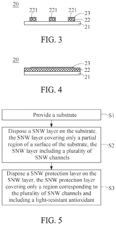 - A novel SNW protection layer structure where the protection layer covers only the regions corresponding to SNW channels on a substrate, incorporating a light-resistant antioxidant and having a variable width and thickness, optionally including SNW dummies and conductive wires, to minimize yellowing and maintain conductivity.