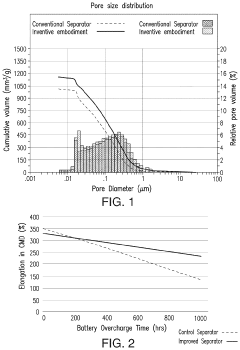 - Separator performance testing and characterization: Developing and implementing advanced testing and characterization methods is crucial for evaluating and improving separator performance. This includes techniques for measuring mechanical properties, ion conductivity, thermal stability, and long-term durability under various operating conditions.