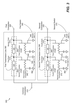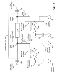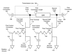 - Configuring GaN-based transistors in a shunt configuration with transmission lines, where each transistor has a terminal coupled to the transmission line and another to ground, allowing signal control through the gate, and incorporating quarter-wavelength connection lengths to improve isolation by presenting an open circuit to the remaining device.