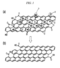 Technical Solution: NEC Corporation has developed advanced reduced graphene oxide (rGO) technologies focused on next-generation computing and telecommunications applications. Their proprietary reduction methods achieve conductivity values of approximately 12,000 S/m while maintaining material stability[1]. NEC's approach integrates rGO into semiconductor devices through specialized deposition techniques that ensure uniform coverage and strong adhesion to various substrates. Their research has yielded breakthrough applications in high-frequency electronics, where rGO-based components demonstrate superior performance at frequencies above 5 GHz compared to traditional materials[3]. NEC has pioneered rGO implementation in memory devices, achieving faster switching speeds and lower power consumption. Their technology incorporates specialized surface functionalization of rGO sheets to enhance compatibility with existing semiconductor manufacturing processes. NEC has also developed rGO-based electromagnetic interference (EMI) shielding solutions that provide 20-30 dB attenuation across a wide frequency spectrum while maintaining flexibility and low weight[6].