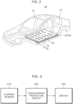 Technical Solution: Tesla has developed a multi-layered approach to battery thermal runaway protection. Their system incorporates advanced overcurrent protection mechanisms that utilize both hardware and software solutions. The hardware includes specialized fuses and circuit breakers that can detect and interrupt excessive current flows within milliseconds. Tesla's Battery Management System (BMS) continuously monitors individual cell voltages, temperatures, and current flows, employing predictive algorithms to identify potential thermal events before they escalate. Their vehicles feature dedicated pyro-fuses that can physically disconnect the battery pack in emergency situations. Tesla has also implemented thermal barrier materials between cells and modules to prevent propagation of thermal events. Their patented technology includes rapid discharge capabilities that can safely reduce battery energy levels when anomalies are detected, significantly reducing thermal runaway risks.