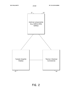 - A thermal management system for batteries that incorporates pyrolytic graphite heat spreaders and thermoelectric devices, allowing for both heating and cooling modes by adjusting electric current polarity, with thermal/electrical connectors to enhance efficiency, and a controller to optimize airflow for temperature regulation.