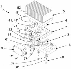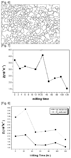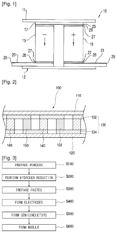 Technical Solution: Panasonic has developed a standardized thermoelectric module platform specifically targeting industrial applications requiring high reliability and consistent performance. Their modules incorporate advanced nano-structured materials that improve ZT values (figure of merit) by approximately 20% compared to conventional bismuth telluride. Panasonic's certification process includes thermal performance validation across -40°C to 200°C operating range, with particular emphasis on stability during thermal cycling. Their industrial modules feature hermetically sealed packaging with specialized ceramic substrates that provide superior thermal stress management and electrical isolation. Panasonic has established comprehensive quality assurance protocols including 100% functional testing of modules against standardized performance metrics and accelerated life testing simulating industrial environments. Their modules comply with international standards including IEC 62830-5 for thermoelectric energy harvesting and have received certification for use in hazardous industrial environments.
