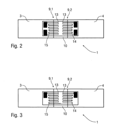 Technical Solution:  STMicroelectronics has pioneered thermopile sensor technology with their MEMS-based infrared sensors that feature silicon thermopile arrays with high sensitivity and fast response times. Their thermopile solutions utilize a silicon-based membrane structure with thermocouples arranged in series to maximize output voltage per incident radiation. ST's thermopile sensors incorporate vacuum packaging technology to minimize thermal conductance losses and improve detection capabilities. The company has developed specialized signal processing algorithms that enhance temperature measurement accuracy to ±0.1°C in their high-end models. ST's thermopile technology features built-in temperature compensation and digital interfaces (I2C/SPI), allowing for easy integration into various systems. Their latest generation sensors achieve response times of approximately 30ms while maintaining power consumption below 100μW during active operation.