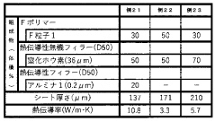 - A composition comprising a fluoroelastomer or tetrafluoroethylene polymer combined with thermally conductive inorganic and filler materials, where the fillers have specific particle size and volume ratios to enhance dispersibility and interaction, resulting in improved mechanical properties, heat resistance, and thermal conductivity while maintaining electrical insulation.