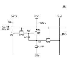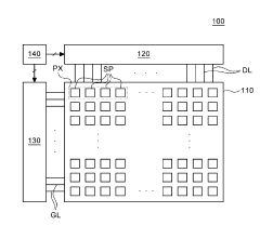 - A display device with a sensing transistor for each sub-pixel to accurately sense and compensate for variations in characteristic values, utilizing a specific arrangement of sub-pixels and reference voltage lines to enhance sensing speed and accuracy.