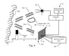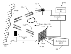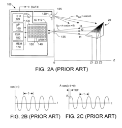 Technical Solution: Sony Semiconductor Solutions has developed advanced Time-of-Flight (ToF) optical systems featuring wide field-of-view (FOV) capabilities up to 120 degrees, utilizing proprietary lens designs and sensor technologies. Their IMX556PLR back-illuminated ToF sensor incorporates specialized micro-lens arrays that maximize light collection efficiency while maintaining wide angular coverage. Sony's approach to vignetting reduction includes optimized optical path designs and sensor-level compensation algorithms that adjust for light fall-off at the periphery of the image. For stray light suppression, Sony implements multi-layer optical filtering technologies combined with their DepthSense™ technology that uses advanced temporal coding patterns to distinguish between direct reflections and multi-path interference. Their systems employ specialized NIR bandpass filters with steep cut-off characteristics to minimize ambient light interference while maximizing signal-to-noise ratio in the sensor's operating wavelength.