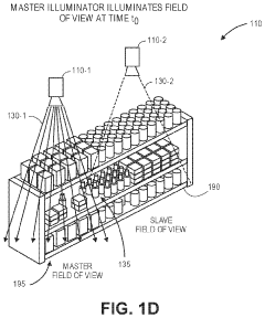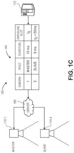 - Designating one camera as a 'master' and others as 'slaves, with predetermined illumination and exposure intervals, allowing slaves to adjust their operations based on the master's illumination to avoid conflicts and ensure synchronized data capture without direct connection.