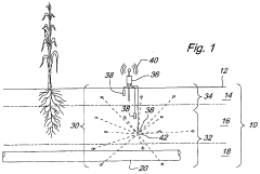 - A network of heterogeneous sensors is deployed across four soil zones, including long-lived passive sensors in sub-tilled and sub-root zones, short-lived passive sensors on the surface or in the root zone, and active sensors with dual transceivers for efficient data collection and communication, utilizing optimized frequencies and protocols for subsurface communication.