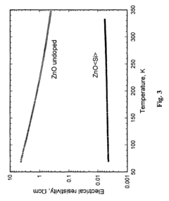 Various doping methods can be employed to enhance the electrical properties of transparent conductive oxides while maintaining optical transparency. These techniques include introducing specific elements or compounds into the oxide structure to increase carrier concentration and mobility. Doping can be achieved through methods such as ion implantation, co-sputtering, or solution-based approaches, resulting in improved conductivity without significant loss of transparency.- Doping techniques for transparent conductive oxides: Various doping methods can be employed to enhance the electrical conductivity and optical transparency of transparent conductive oxides (TCOs). These techniques involve introducing specific elements or compounds into the oxide structure to modify its electronic properties. Doping can improve carrier concentration and mobility while maintaining high optical transparency, which is crucial for applications in displays, solar cells, and touch panels.