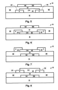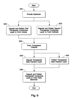Transparent electrodes are crucial components in transparent transistor technology, particularly for display applications. These electrodes, typically made from materials like indium tin oxide (ITO) or other transparent conductive oxides, allow light to pass through while maintaining electrical conductivity. The design and configuration of these electrodes significantly impact the overall transparency and performance of the transistor-based display devices.Expand Specific Solutions03 Fabrication methods for transparent transistor arrays