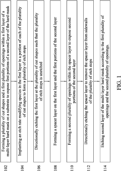 - A self-aligned litho-etch (SALE) process is developed, involving the formation of cut shapes and etch stops in a multi-layer hard mask, where etch rate modifying species are implanted to reduce etch resistance, followed by directional etching and spacer layer manipulation to achieve end-to-end spacing smaller than the lithographic resolution limit.