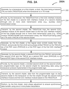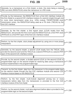 - The implementation of low-latency aligned data streams between chiplets through UCIe interface modules, which includes transmitting transceiver-generated clocks directly between chiplets, bypassing protocol layers, and using alignment circuitry for flexible module alignment.