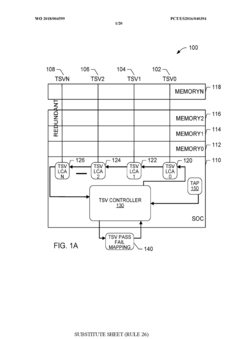 Technical Solution: Qualcomm has pioneered UCIe chiplet interconnect solutions focusing on mobile and edge computing applications. Their approach balances performance with power efficiency, utilizing a combination of micro-bump technology for standard connections and advanced hybrid bonding for high-performance interfaces. Qualcomm's UCIe implementation achieves approximately 1.5 TB/s/mm² bandwidth density with power consumption around 0.7 pJ/bit. Their TSV technology employs high aspect ratio vias (10:1) with diameters of approximately 5μm, enabling dense vertical connections while minimizing silicon area impact. Qualcomm has developed a proprietary "adaptive power management" system for their chiplet interconnects that dynamically adjusts signaling voltage and frequency based on bandwidth demands, further optimizing power efficiency. Their solution includes built-in test and repair mechanisms to improve manufacturing yield and reliability, particularly important for hybrid bonding processes where defect management is critical.