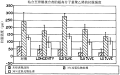 - Chemical modification of UHMWPE for improved adhesion: Chemical modification techniques can be employed to alter the molecular structure of UHMWPE, enhancing its bonding capabilities. These methods include grafting functional groups onto the polymer chains, crosslinking treatments, and the incorporation of compatibilizing agents. By introducing reactive sites or increasing the chemical compatibility with adhesives or other materials, these modifications significantly improve the bond integrity of UHMWPE without compromising its desirable mechanical properties such as wear resistance and impact strength.