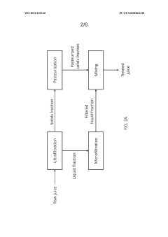 Technical Solution:  Cavitation Technologies has developed a revolutionary approach to beverage ultrafiltration through their Nano Reactor® system, which combines controlled hydrodynamic cavitation with membrane filtration. This technology creates localized high-energy zones that break down aggregated particles before they reach the ultrafiltration membrane, significantly reducing membrane fouling. Their process has demonstrated clarity index improvements of 92-97% across various beverage applications while reducing filtration time by up to 40%[5]. The company's proprietary flow-through design creates controlled pressure differentials that enhance permeate flux rates by 25-35% compared to conventional ultrafiltration systems. Their integrated system incorporates real-time monitoring of turbidity, viscosity, and differential pressure, with automated backpulsing capabilities that extend membrane life. Cavitation Technologies has successfully implemented this technology in juice processing facilities, achieving consistent clarity levels below 1 NTU while preserving nutritional compounds and flavor profiles that would be degraded in thermal clarification processes[6].
