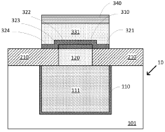 Resistive RAM (RRAM) devices are constructed with specific structures to enable resistive switching behavior. These structures typically include a resistive switching layer sandwiched between two electrodes. Various materials can be used for the resistive switching layer, such as metal oxides, and different electrode configurations can be employed to optimize device performance. The structural design of RRAM devices affects key parameters like switching speed, endurance, and retention time.- Materials and structures for RRAM devices: Resistive Random Access Memory (RRAM) devices utilize specific materials and structures to enable resistive switching behavior. These typically include metal oxides like HfO2, TiO2, or Ta2O5 as the switching layer sandwiched between two electrodes. The structure may incorporate additional layers such as barrier layers or doping elements to enhance performance. The specific arrangement and composition of these materials significantly impact the device's switching characteristics, endurance, and retention properties.