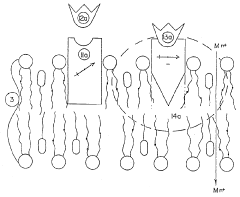 - The use of ion-permeable lipid membranes, specifically bilayer lipid membranes (BLMs), which alter conductivity in response to chemical species through membrane-bound receptor-stimulant interactions, allowing direct measurement of transmembrane ion flux for concentration determination without relying on complexation reaction evolution or secondary product measurements.