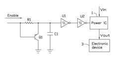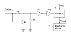 - A voltage-stabilizing circuit comprising a resistor, capacitor, pnp-type bipolar junction transistor, and Schmitt triggers is connected to the enable pin of the power IC, forming an RC circuit that stabilizes the output voltage by charging and discharging the capacitor to ensure a stable enable signal is transmitted to the power IC.