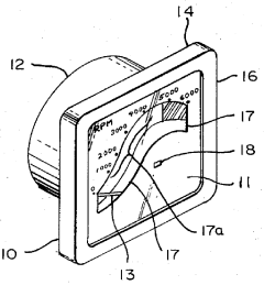 - A display cover with specialized viewing windows that graphically relates the measured engine RPM to power output and efficiency, using a curved band to represent the proportional relationship, and includes a flag mechanism to indicate critical or unsafe RPM ranges, enhancing operator understanding through visual cues.