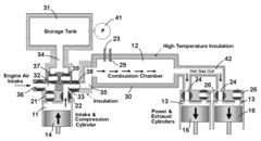 - A split cycle engine design where air is compressed and stored, then used to drive an expansion chamber, allowing for increased power output by varying air intake and using a blower or pneumatic storage to recapture energy, thereby maintaining efficiency and reducing costs.