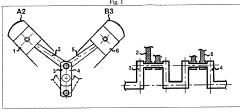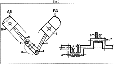 - The solution involves a crankshaft system with alternating functions between cylinder banks, optimizing the angle between banks to reduce mechanical stress and improve ventilation coordination by staggering the power and exhaust strokes, allowing for constant-pressure ventilation and synchronized suction, using a 45/60/90-degree angle pattern and specific manifold configurations.