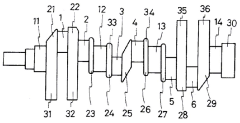 - A crankshaft design for V-type 6-cylinder engines incorporating front and rear balance plates to adjust inertial force, replacing the need for balancing weights on the crankpin, with the front balance plate attached to the journal extension shaft and the rear balance plate mounted on the rear flange, each with specific mass bodies to maintain balance.