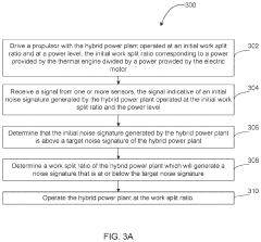 - A method and system that utilize sensors to measure noise signatures and adjust the work split ratio between thermal engines and electrical motors based on a database correlation, allowing the hybrid power plant to operate within target noise signature ranges, and optionally switch to a whisper mode during noise-restricted flight phases.