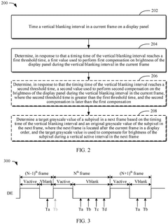 - A method that involves timing the vertical blanking interval and determining compensation values in real-time to adjust the analog voltage, ensuring timely brightness compensation and reducing flicker by segment-based compensation, considering grayscale and chrominance differences across different refresh rates.