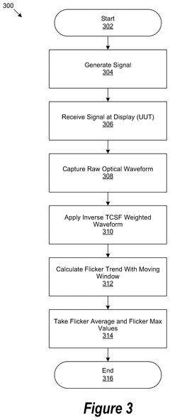 - A system and method that captures a raw optical waveform from a display, applies an inverse Fast Fourier Transform of the Temporal Contrast Sensitivity Function (TCSF) to generate a weighted luminance waveform, and uses a moving time window to calculate the flicker trend, determining VRR flicker by taking the average and maximum flicker values.