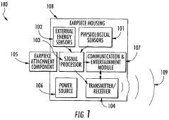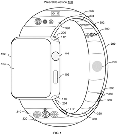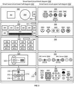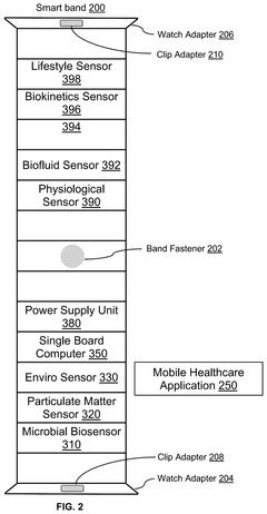 Technical Solution: Samsung has developed a comprehensive wearable biosensor ecosystem for environmental monitoring that integrates with their consumer electronics portfolio. Their technology centers around the Samsung Advanced Institute of Technology's (SAIT) flexible and stretchable sensor platforms that can be incorporated into everyday wearables like smartwatches and fitness bands. These sensors utilize advanced materials including graphene-based gas sensors capable of detecting multiple air pollutants at parts-per-billion levels. Samsung's environmental monitoring biosensors feature low-power microcontrollers optimized for continuous sensing with minimal battery drain, achieving up to 7 days of continuous environmental monitoring[2]. Their system architecture includes edge computing capabilities that process environmental data locally before transmission, reducing power consumption while providing real-time alerts about environmental hazards. Samsung has also developed specialized algorithms that correlate environmental exposure data with physiological responses, enabling personalized environmental health insights through their Samsung Health platform. The company has integrated UV sensors, air quality monitors, and temperature/humidity sensors into a unified wearable platform that provides comprehensive environmental context.
