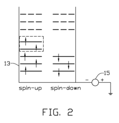 - 02 Catalytic materials for spintronic applicationsNovel catalytic materials are being developed specifically for spintronic device fabrication. These materials facilitate the growth of high-quality magnetic thin films and interfaces critical for spin transport. Catalytic innovations include the use of transition metal compounds that promote controlled crystallization and interface formation. These advances enable the production of spintronic devices with enhanced spin polarization efficiency, reduced energy consumption, and improved switching characteristics, making them more suitable for next-generation computing applications.Expand Specific Solutions