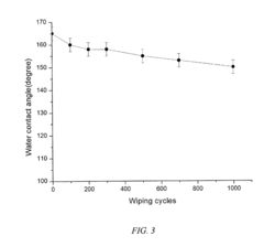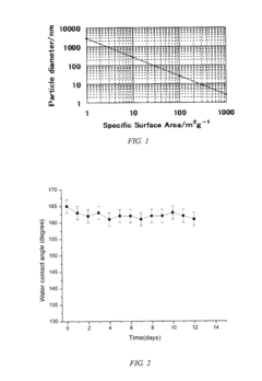 Nanoparticles are incorporated into coating formulations to create hierarchical surface structures necessary for superhydrophobicity. Materials such as silica nanoparticles, titanium dioxide, carbon nanotubes, and zinc oxide are commonly used. These nanoparticles create the required surface roughness while fluorinated or silane compounds provide the low surface energy. The challenge in scaling involves maintaining uniform nanoparticle dispersion and preventing agglomeration during large-scale production to ensure consistent superhydrophobic performance.Expand Specific Solutions03 Durability enhancement for industrial applications
