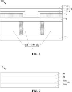 Hybrid encapsulation systems combine the advantages of inorganic barrier materials (excellent moisture and oxygen blocking) with organic materials (flexibility and impact resistance). These systems often feature inorganic layers deposited by atomic layer deposition (ALD) or chemical vapor deposition (CVD) combined with organic layers applied via solution processes. The hybrid approach creates encapsulation structures that can withstand repeated bending cycles while maintaining barrier performance. Some designs incorporate nanocomposite materials that provide both barrier properties and mechanical flexibility in a single layer.Expand Specific Solutions04 Mechanical reinforcement structures for encapsulation