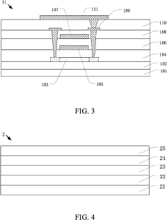 Technical Solution: BOE has developed a comprehensive flexible OLED encapsulation solution utilizing a multi-layer barrier film technology. Their approach incorporates alternating layers of inorganic barrier films (primarily aluminum oxide and silicon nitride) deposited via atomic layer deposition (ALD) and organic planarization layers applied through vapor deposition processes. This structure creates a tortuous path for moisture and oxygen molecules, significantly extending the diffusion path length. BOE's encapsulation technology achieves water vapor transmission rates below 10^-5 g/m²/day while maintaining mechanical flexibility that allows for bending radii as small as 3mm. Their process includes a proprietary stress-relief mechanism in the organic layers that incorporates elastomeric polymers with high elongation properties (>150%) to absorb mechanical stress during flexing operations. BOE has also developed specialized edge sealing techniques to prevent lateral ingress of contaminants, which is often a critical failure point in flexible displays.