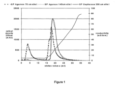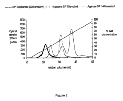 - A method utilizing an adsorbent with a controlled charge density between 10 to 100 μmol/ml, specifically 30 to 80 μmol/ml, to selectively bind ionic components without the need for competing salts, achieved by optimizing the charge density of the adsorbent surface, allowing for high selectivity and capacity at lower costs.