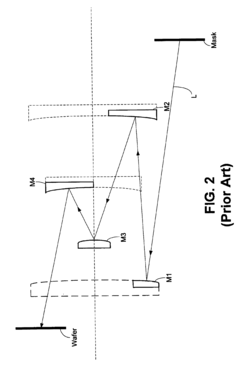 EUV optical systems rely on complex reflective optics rather than traditional refractive lenses. These systems face challenges including mirror surface accuracy, multilayer coating uniformity, thermal management, and minimizing wavefront errors. The projection optics must maintain extreme precision while handling the thermal load from EUV radiation. Achieving and maintaining the required optical performance is critical for resolution, overlay accuracy, and pattern fidelity.Expand Specific Solutions04 Photoresist and pattern development challenges