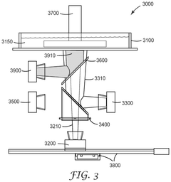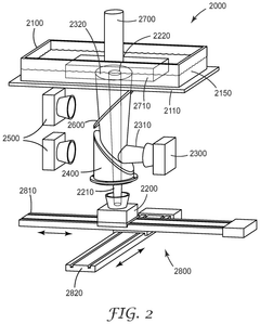 Multi-beam projection systems and tomographic approaches represent advanced methods for improving resolution in volumetric additive manufacturing. By utilizing multiple light sources or computed tomography principles, these techniques enable the creation of complex internal structures with high precision. The controlled intersection of multiple light beams can create localized polymerization points, while tomographic reconstruction algorithms allow for the generation of highly detailed volumetric objects with improved resolution throughout the entire build volume.Expand Specific Solutions04 Real-time monitoring and feedback systems for resolution control