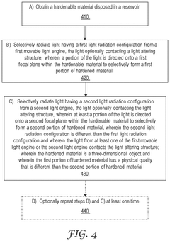 Technical Solution: Lawrence Livermore National Laboratory (LLNL) has pioneered Computed Axial Lithography (CAL) for volumetric additive manufacturing, focusing extensively on resolution optimization. Their research has identified that resolution is determined by: the optical projection system (including numerical aperture and aberration control), photopolymer chemistry (developing resins with precise threshold behavior and minimal light scattering), and computational reconstruction algorithms. LLNL has developed sophisticated image processing techniques that pre-compensate for optical distortions and material nonlinearities, significantly enhancing achievable resolution. Their system rotates a cylindrical container of photosensitive resin while projecting computed patterns from different angles, creating complex structures in minutes rather than hours. LLNL has achieved resolutions approaching 35 micrometers in their latest systems, with particular focus on applications requiring complex internal geometries.